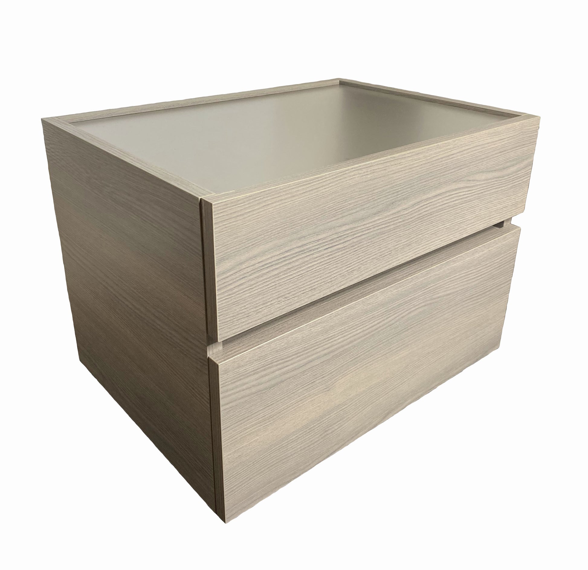 The night plays with volumes, geometrics, colour contrasts and textures. Floor-standing bedside units.